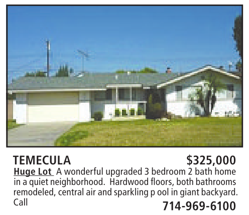 TEMECULA $325,000 Huge Lot Awonderfulupgraded 3bedroom 2bathhome in aquietneighborhood. Hardwood floors,bothbathrooms remodeled, centralair andsparkling pool in giantbackyard. Call 714-969-6100