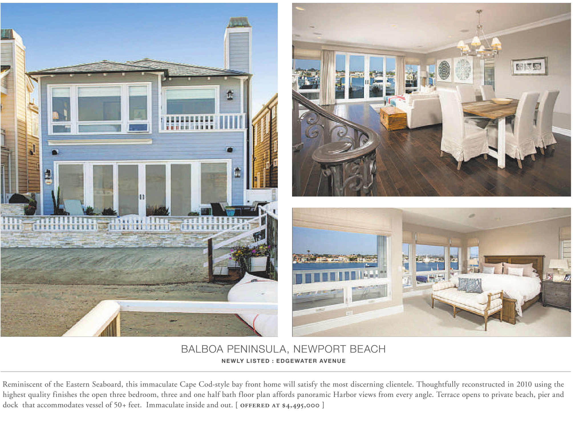 BALBOA PENINSULA, NEWPORT BEACH NEWLY LISTED : EDGEWATER AVENUE Reminiscent of the Eastern Seaboard, this immaculate Cape Cod-style bay front home will satisfy the most discerning clientele. Thoughtfully reconstructed in 2010 using the highest quality finishes the open three bedroom, three and one half bath floor plan affords panoramic Harbor views from every angle. Terrace opens to private beach, pier and dock that accommodates vessel of 50+ feet. Immaculate inside and out. [ offered at $4,495,000 ] See also