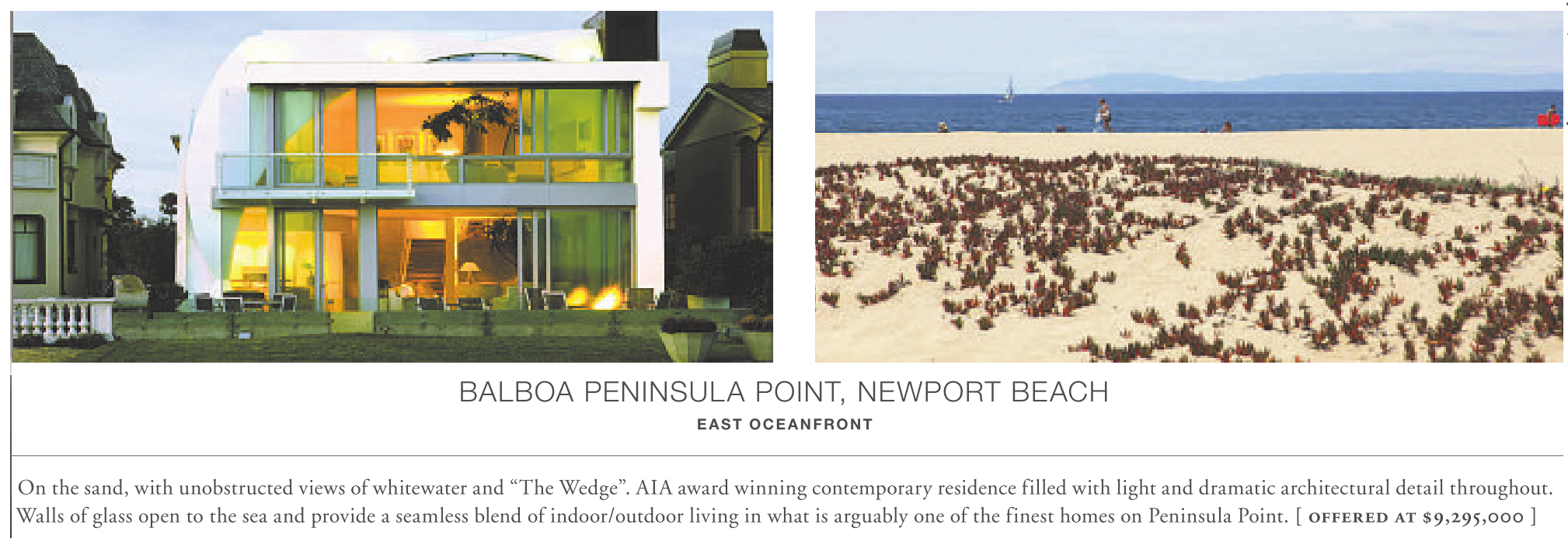 On the sand, with unobstructed views of whitewater and “The Wedge”. AIA award winning contemporary residence filled with light and dramatic architectural detail throughout. Walls of glass open to the sea and provide a seamless blend of indoor/outdoor living in what is arguably one of the finest homes on Peninsula Point. [ offered at $9,295,000 ]