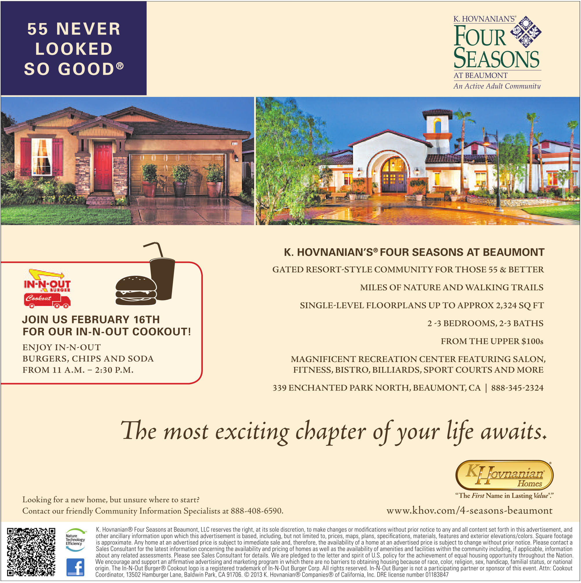 K. Hovnanian®FourSeasons at Beaumont, LLCreserves theright,atits sole discretion, to make changesormodifications withoutprior notice to anyand allcontent set forthinthis advertisement, and otherancillaryinformationuponwhich this advertisementisbased,including, butnot limited to,prices,maps, plans, specifications, materials, features andexteriorelevations/colors.Squarefootage is approximate. Anyhome at an advertised price is subject to immediatesaleand,therefore,the availability of ahome at an advertised price is subject to change withoutprior notice.Pleasecontact a SalesConsultantfor thelatestinformation concerningthe availability andpricing of homesaswellasthe availability of amenities andfacilities within thecommunityincluding, if applicable,information aboutany related assessments.Pleasesee SalesConsultantfor details. We arepledgedtothe letter andspiritofU.S. policy forthe achievement of equalhousingopportunity throughout theNation.