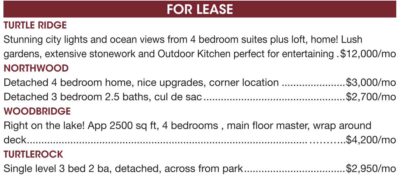 TURTLE RIDGE FOR LEASE Stunning city lights and ocean views from 4 bedroom suites plus loft, home! Lush gardens, extensive stonework and Outdoor Kitchen perfect for entertaining .$12,000/mo NORTHWOOD Detached 4 bedroom home, nice upgrades, corner location ......................$3,000/mo Detached 3 bedroom 2.5 baths, cul de sac .................................................$2,700/mo WOODBRIDGE Right on the lake! App 2500 sq ft, 4 bedrooms , main floor master, wrap around deck................................................................................................. ………..$4,200/mo TURTLEROCK Single level 3 bed 2 ba, detached, across from park...................................$2,950/mo