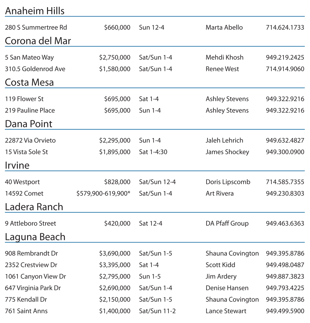 40 Westport $828,000 Sat/Sun 12-4 Doris Lipscomb 714.585.7355 14592 Comet $579,900-619,900* Sat/Sun 1-4 ArtRivera 949.230.8303