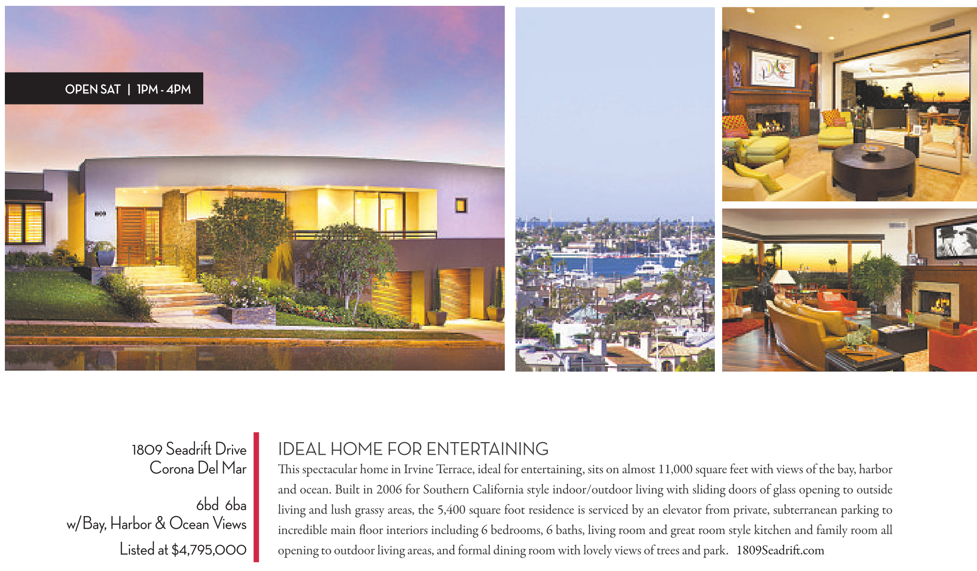 OPEN SAT | 1PM -4PM 1809 Seadrift Drive Corona Del Mar 6bd 6ba w/Bay, Harbor & Ocean Views Listed at $4,795,000 IDEAL HOME FOR ENTERTAINING Thisspectacular homeinIrvineTerrace, idealfor entertaining,sitsonalmost11,000 squarefeetwithviews of thebay,harbor and ocean. Built in 2006 for Southern California style indoor/outdoor living with sliding doors of glass opening to outside living and lush grassy areas, the 5,400 square foot residence is serviced by an elevator from private, subterranean parking to incredible main floor interiors including 6 bedrooms, 6 baths, living room and great room style kitchen and family room all opening to outdoor living areas, and formaldining room withlovely viewsoftrees and park. 1809Seadrift.com