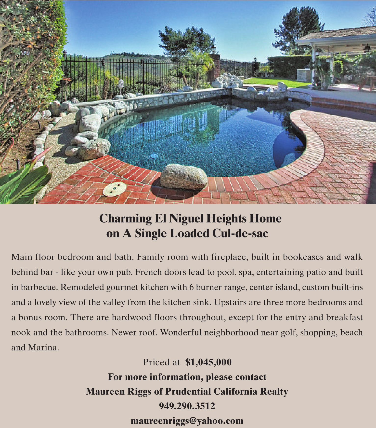 Charming El Niguel Heights Home on A Single Loaded Cul-de-sac Main floor bedroom and bath. Family room with fireplace, built in bookcases and walk behind bar - like your own pub. French doors lead to pool, spa, entertaining patio and built in barbecue. Remodeled gourmet kitchen with 6 burner range, center island, custom built-ins and a lovely view of the valley from the kitchen sink. Upstairs are three more bedrooms and a bonus room. There are hardwood floors throughout, except for the entry and breakfast nook and the bathrooms. Newer roof. Wonderful neighborhood near golf, shopping, beach and Marina. Priced at $1,045,000 For more information, please contact Maureen Riggs of Prudential California Realty 949.290.3512 maureenriggs@yahoo.com