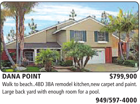 DANA POINT $799,900 Walk to beach..4BD 3BAremodel kitchen,new carpet and paint. Large back yard with enough room for apool.