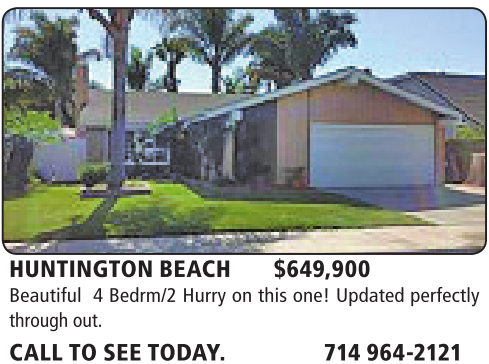 HUNTINGTON BEACH $649,900 Beautiful 4 Bedrm/2 Hurry on this one! Updated perfectly through out. CALL TO SEE TODAY. 714 964-2121