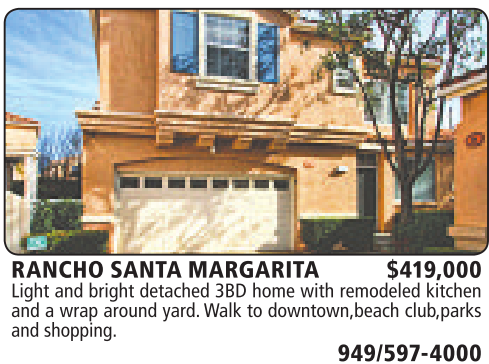 RANCHO SANTA MARGARITA $419,000 Light and bright detached 3BD home with remodeled kitchen and awrap around yard. Walk to downtown,beach club,parks and shopping.