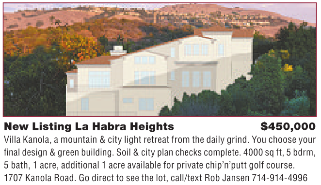 New Listing La Habra Heights $450,000 VillaKanola, amountain&citylight retreatfromthe daily grind. Youchooseyour final design&green building. Soil &cityplancheckscomplete. 4000 sq ft,5bdrm, 5bath, 1acre, additional 1acreavailablefor privatechip’n’puttgolf course. 1707 KanolaRoad. Go direct to see thelot, call/textRob Jansen 714-914-4996