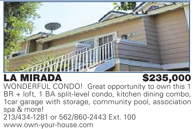 LA MIRADA $235,000 WONDERFUL CONDO! Great opportunity to own this 1BR + loft, 1 BA split-level condo, kitchen dining combo, 1car garage with storage, community pool, association spa & more! 213/434-1281 or 562/860-2443 Ext. 100 www.own-your-house.com