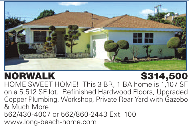 $169,900 NORWALK $314,500 HOME SWEET HOME! This 3 BR, 1 BA home is 1,107 SF on a 5,512 SF lot. Refinished Hardwood Floors, Upgraded Copper Plumbing, Workshop, Private Rear Yard with Gazebo & Much More! 562/430-4007 or 562/860-2443 Ext. 100 www.long-beach-home.com