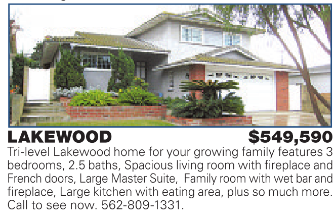LAKEWOOD $549,590 Tri-level Lakewood home for your growing family features 3bedrooms, 2.5 baths, Spacious living room with fireplace and French doors, LargeMaster Suite, Family room with wetbar and fireplace, Large kitchen with eating area, plus so much more. Call to see now. 562-809-1331.