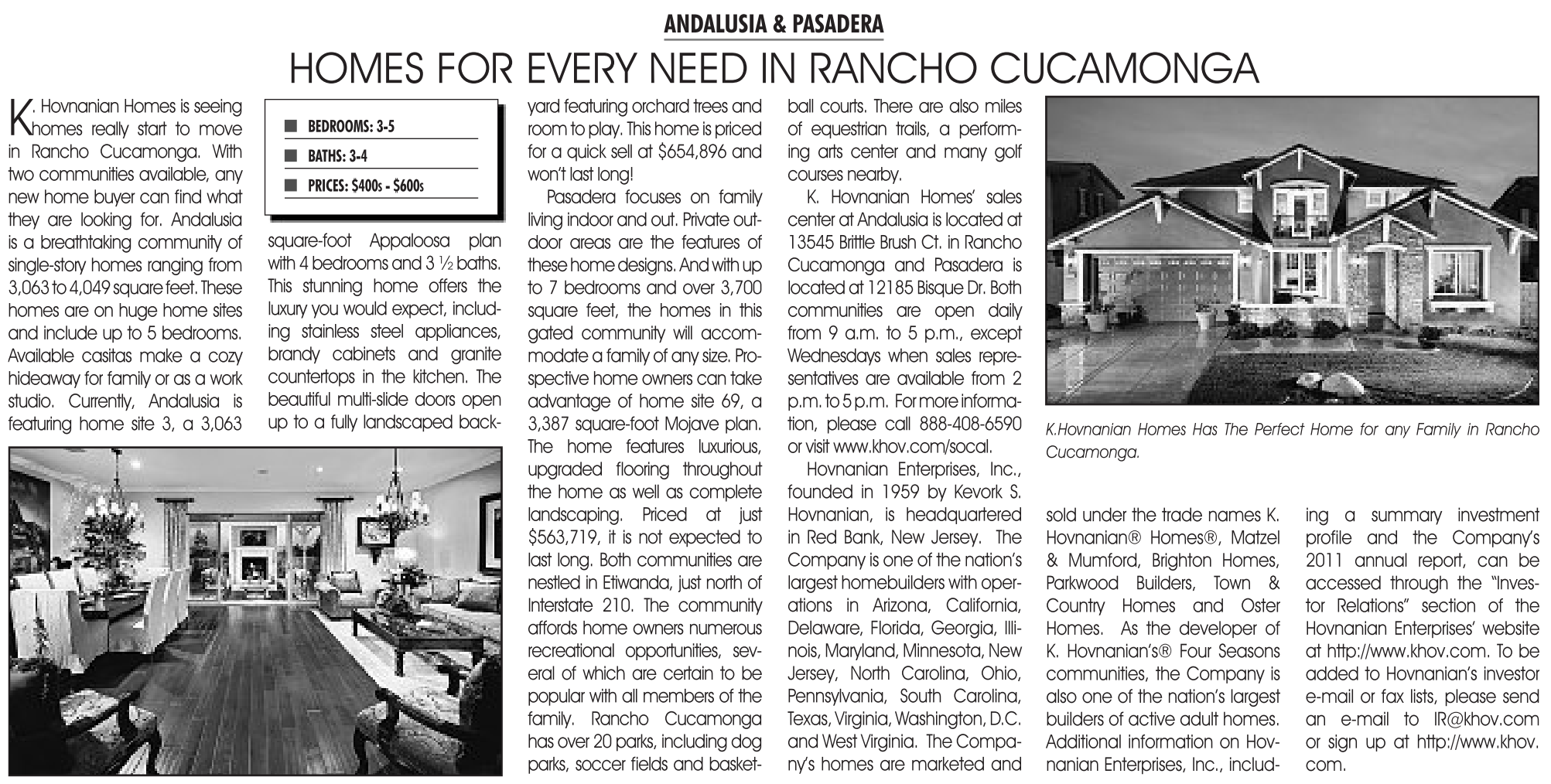 K. Hovnanian Homes’ sales center at Andalusia is located at 13545 Brittle Brush Ct. in Rancho Cucamonga and Pasadera is located at 12185 Bisque dr. Both communities are open daily from 9 a.m. to 5 p.m., except Wednesdays when sales representatives are available from 2 p.m. to 5p.m. formore information, please call 888-408-6590 or visit www.khov.com/socal.