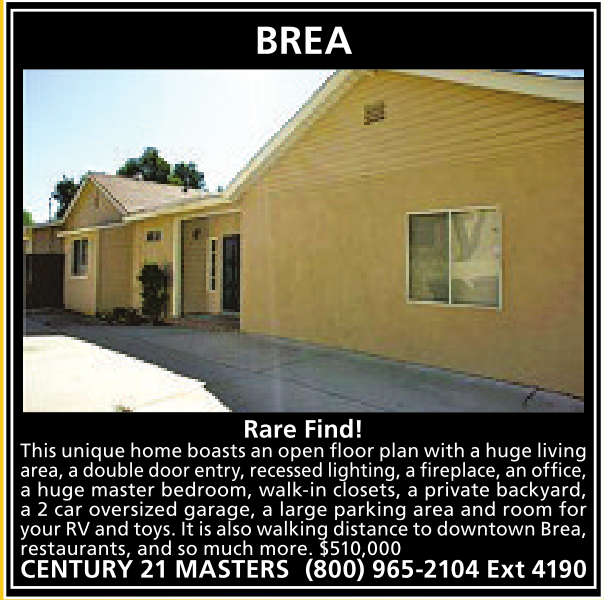 BREA Rare Find! This unique home boasts an open floor plan withahuge living area,adouble door entry, recessed lighting,afireplace, an office, a huge master bedroom, walk-in closets, a private backyard, a 2 car oversized garage, a large parking area and room for your RV andtoys. It is also walkingdistancetodowntownBrea, restaurants, and somuch more. $510,000 CENTURY 21 MASTERS (800) 965-2104 Ext 4190