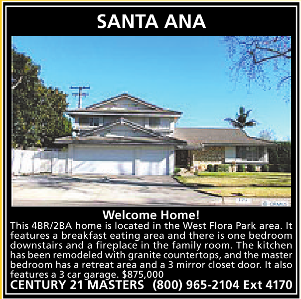 SANTA ANA Welcome Home! This 4BR/2BA home is located in the West Flora Park area. It features a breakfast eating area and there is one bedroom downstairs and a fireplace in the family room. The kitchen hasbeenremodeledwithgranite countertops, andthe master bedroom has aretreat area and a3mirror closet door. Italso features a3car garage. $875,000 CENTURY 21 MASTERS (800) 965-2104 Ext 4170 See also