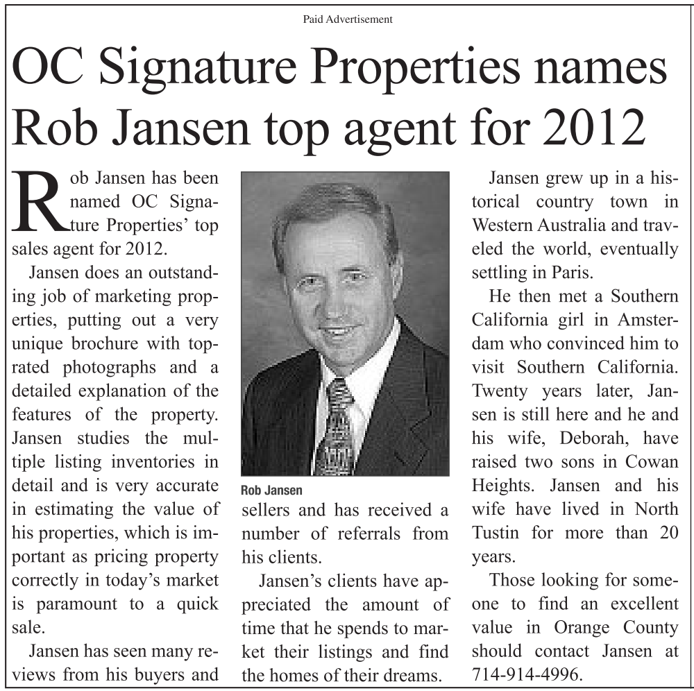 Rob Jansen has been named OC Signature Properties’ top sales agent for 2012. Jansen does an outstanding job of marketing properties, putting out a very unique brochure with toprated photographs and a detailed explanation of the features of the property. Jansen studies the multiple listing inventories in detail and is very accurate in estimating the value of his properties, which is important as pricing property correctly in today’s market is paramount to a quick sale. Jansen has seen many reviews from his buyers and sellers and has received a number of referrals from his clients. Jansen’s clients have appreciated the amount of time that he spends to market their listings and find the homes of their dreams. Paid Advertisement OC Signature Properties names Rob Jansen top agent for 2012 Rob Jansen Jansen grew up in a historical country town in Western Australia and traveled the world, eventually settling in Paris. He then met a Southern California girl in Amsterdam who convinced him to visit Southern California. Twenty years later, Jansen is still here and he and his wife, Deborah, have raised two sons in Cowan Heights. Jansen and his wife have lived in North Tustin for more than 20 years. Those looking for someone to find an excellent value in Orange County should contact Jansen at 714-914-4996.