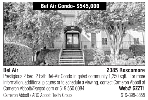 Bel Air Bel Air Condo- $545,000 2385 Roscomore Prestigious 2bed, 2bath Bel-Air Condo in gated community.1,250 sqft. For more information, additional pictures or to schedule aviewing, contact Cameron Abbott at Cameron.Abbott@argsd.com or 619.550.6084 Web# GZZT1 Cameron Abbott /ARG Abbott Realty Group 619-398-3858 See also