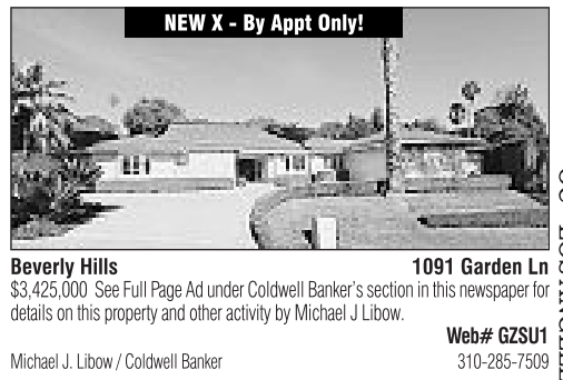 Beverly Hills NEW X-ByAppt Only! 1091 Garden Ln $3,425,000 See Full Page Ad under Coldwell Banker’s section in this newspaper for details on this property and other activity by Michael JLibow. Web# GZSU1 Michael J. Libow /Coldwell Banker 310-285-7509 See also