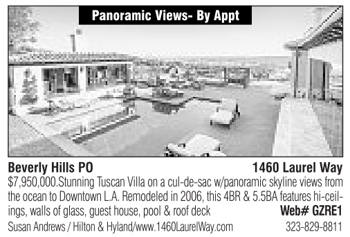 Beverly Hills PO Panoramic Views- By Appt 1460 Laurel Way $7,950,000.Stunning Tuscan Villa on acul-de-sac w/panoramic skyline views from the ocean to Downtown L.A. Remodeled in 2006, this 4BR &5.5BA features hi-ceilings, walls of glass, guest house, pool &roof deck Web# GZRE1 Susan Andrews /Hilton &Hyland/www.1460LaurelWay.com 323-829-8811 See also
