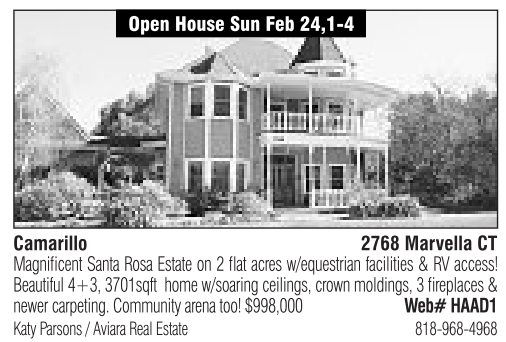 Camarillo Open House Sun Feb 24,1-4 2768 Marvella CT Magnificent Santa Rosa Estate on 2flat acres w/equestrian facilities &RVaccess! Beautiful 4+3, 3701sqft home w/soaring ceilings, crown moldings, 3fireplaces & newer carpeting. Community arena too! $998,000 Web# HAAD1 Katy Parsons /Aviara Real Estate 818-968-4968
