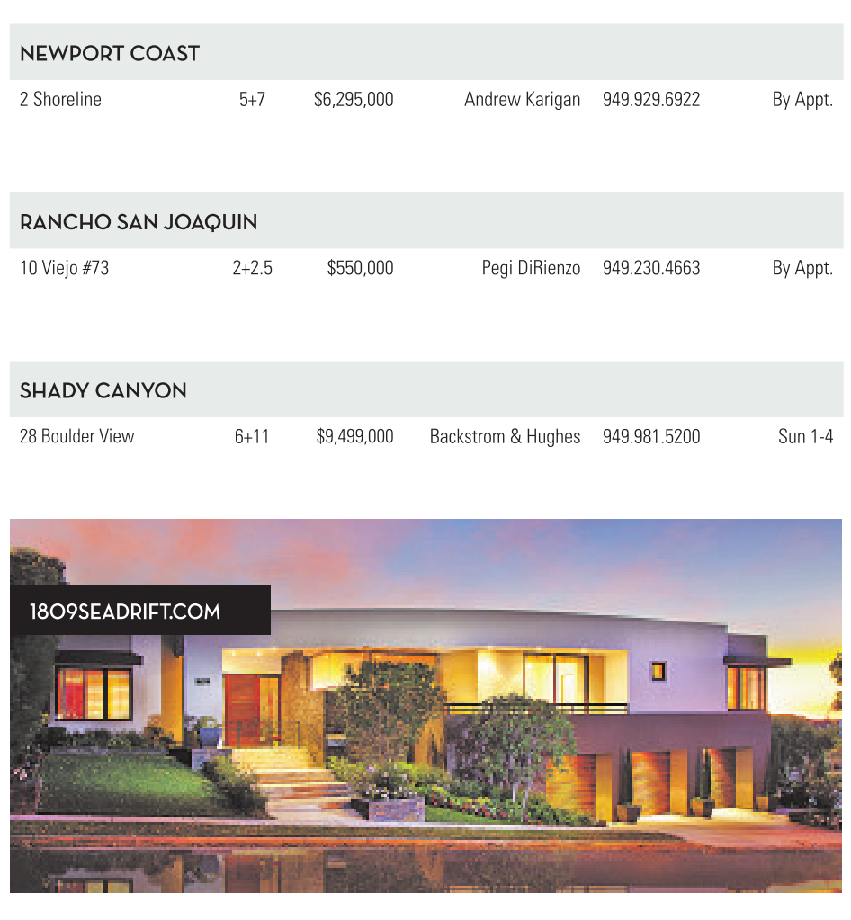 NEwpoRTCoAsT 2Shoreline 5+7 $6,295,000 Andrew Karigan 949.929.6922 By Appt. RANCHo sANJoAQUIN 10 Viejo #73 2+2.5 $550,000 Pegi DiRienzo 949.230.4663 By Appt. sHAdyCANyoN 28 Boulder View 6+11 $9,499,000 Backstrom &Hughes 949.981.5200 Sun 1-4 1809seadrift.com