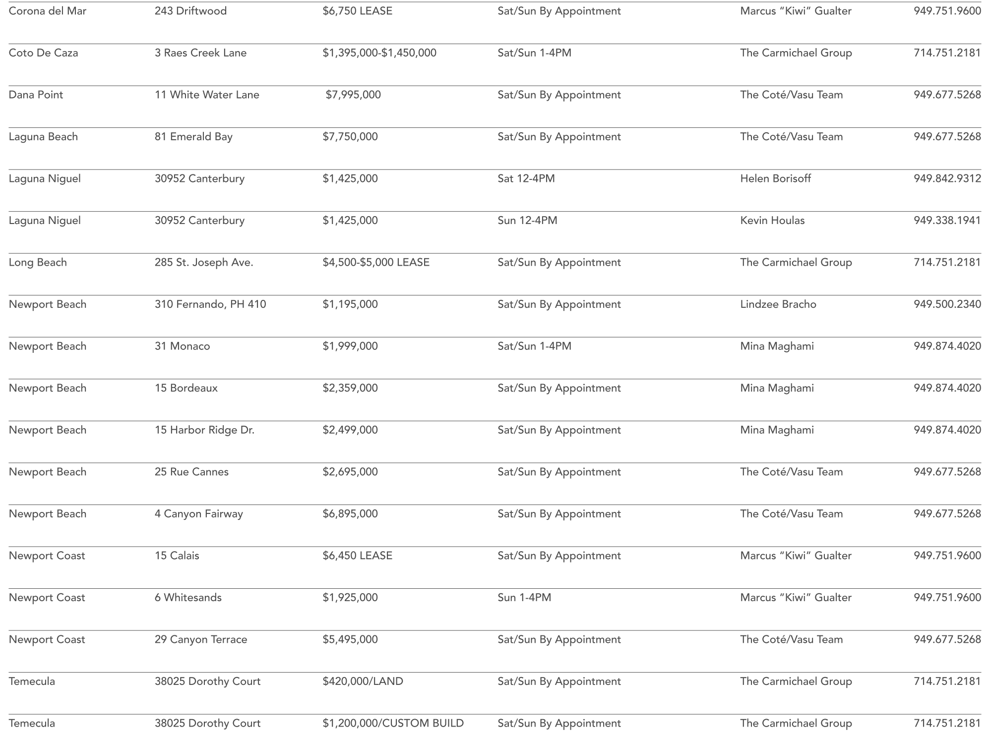 Newport Beach 15 Bordeaux $2,359,000 Sat/Sun By Appointment Mina Maghami 949.874.4020