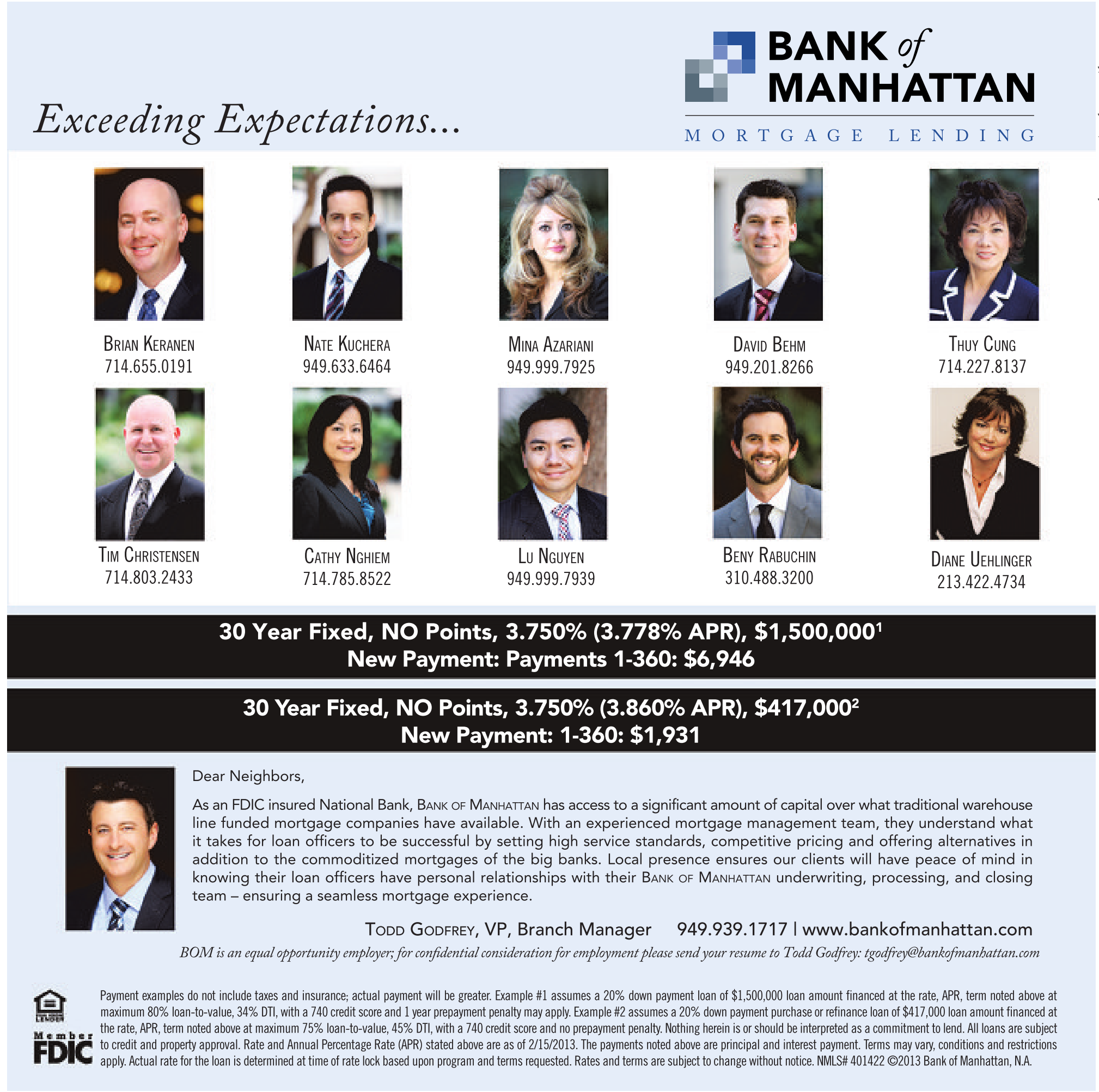 Payment examples do not include taxes and insurance; actual payment will be greater. Example #1 assumes a 20% down payment loan of $1,500,000 loan amount financed at the rate, APR, term noted above at maximum 80% loan-to-value, 34% DTI, with a740 credit score and 1year prepayment penalty may apply.Example #2 assumes a20% down payment purchase or refinance loan of $417,000 loan amount financed at the rate, APR, term noted above at maximum 75% loan-to-value, 45% DTI, with a740 credit score and no prepayment penalty.Nothing herein is or should be interpreted as acommitment to lend. All loans are subject to credit and property approval. Rate and Annual Percentage Rate (APR) stated above are as of 2/15/2013. The payments noted above are principal and interest payment. Terms may vary,conditions and restrictions apply.Actual rate for the loan is determined at time of rate lock based upon program and terms requested. Rates and terms are subject to change without notice. NMLS# 401422 ©2013 Bank of Manhattan, N.A.