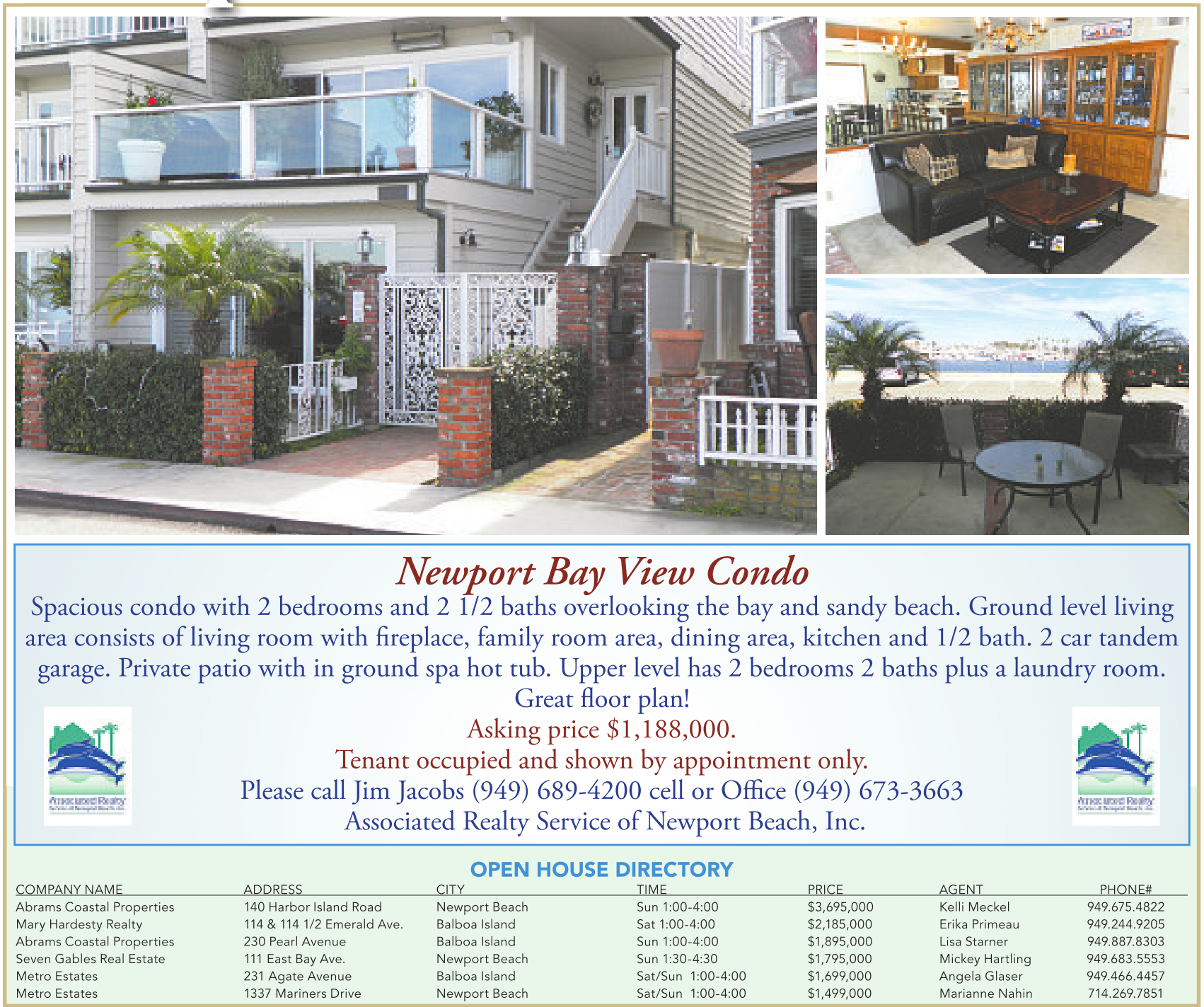 Newport Bay View Condo Spacious condo with 2 bedrooms and 2 1/2 baths overlooking the bay and sandy beach. Ground level living area consists of living room with fireplace, family room area, dining area, kitchen and 1/2 bath. 2 car tandem garage. Private patio with in ground spa hot tub. Upper level has 2 bedrooms 2 baths plus a laundry room. Great floor plan! Asking price $1,188,000. Tenant occupied and shown by appointment only. Please call Jim Jacobs (949) 689-4200 cell or Office (949) 673-3663 Associated Realty Service of Newport Beach, Inc. OPEN HOUSE DIRECTORY COMPANY NAME ADDRESS CITY TIME PRICE AGENT PHONE# Abrams Coastal Properties 140 Harbor Island Road Newport Beach Sun 1:00-4:00 $3,695,000 Kelli Meckel 949.675.4822 Mary Hardesty Realty 114&114 1/2 Emerald Ave. Balboa Island Sat 1:00-4:00 $2,185,000 Erika Primeau 949.244.9205 Abrams Coastal Properties 230 Pearl Avenue Balboa Island Sun 1:00-4:00 $1,895,000 Lisa Starner 949.887.8303 Seven Gables Real Estate 111 East Bay Ave. Newport Beach Sun 1:30-4:30 $1,795,000 Mickey Hartling 949.683.5553 Metro Estates 231 Agate Avenue Balboa Island Sat/Sun 1:00-4:00 $1,699,000 Angela Glaser 949.466.4457 Metro Estates 1337 Mariners Drive Newport Beach Sat/Sun 1:00-4:00 $1,499,000 Marianne Nahin 714.269.7851