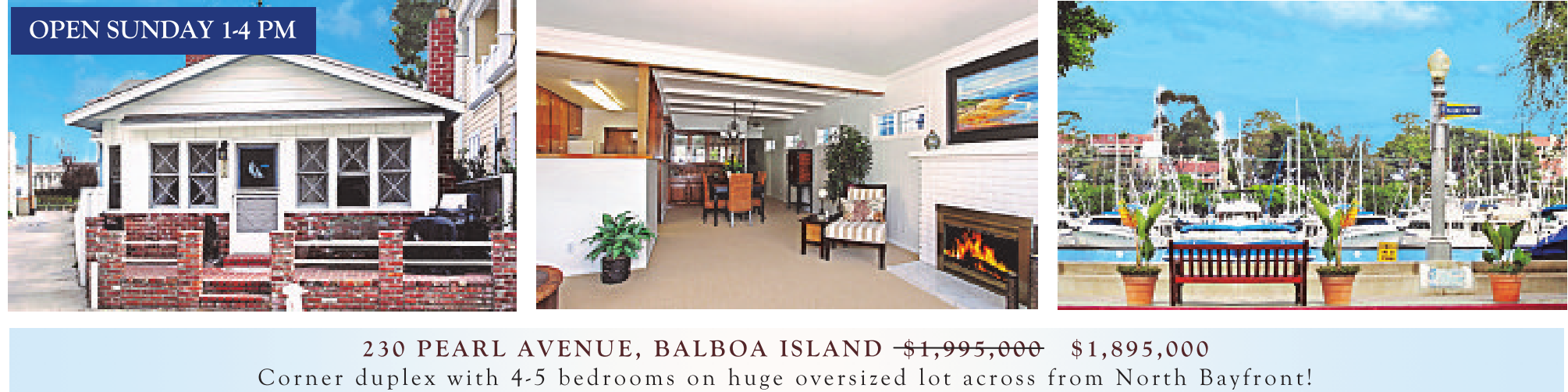 230 PEARL AVENUE, BALBOA ISLAND $1,995,000 $1,895,000 Corner duplex with 4-5 bedrooms on huge oversized lot across from North Bayfront!