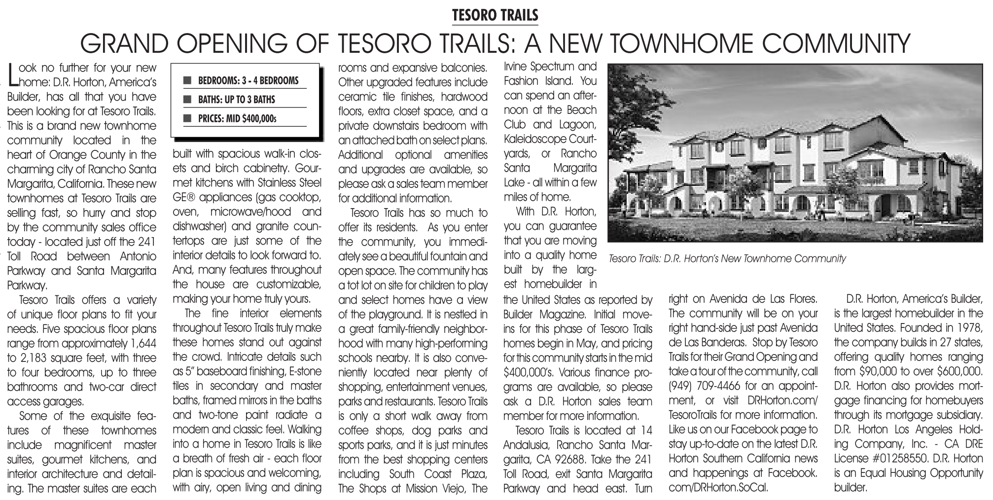 right on avenida de Las Flores. The community will be on your right hand-side just past avenida de LasBanderas. Stop by Tesoro Trails for their grand Opening and take atour of the community, call (949) 709-4466 for an appointment, or visit DrHorton.com/ TesoroTrails for more information. Like us on our Facebook page to stay up-to-date on the latest D.r. Horton Southern California news and happenings at Facebook. com/DrHorton.SoCal.