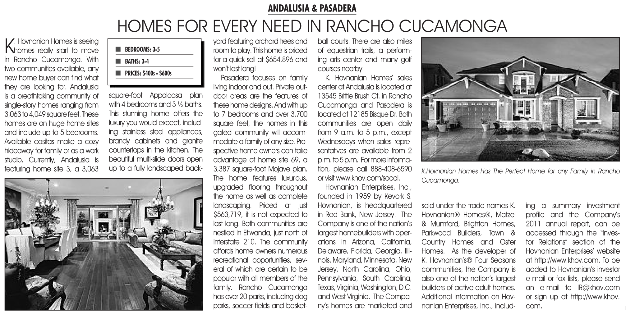 K. Hovnanian Homes’ sales center at Andalusia is located at 13545 Brittle Brush Ct. in Rancho Cucamonga and Pasadera is located at 12185 Bisque dr. Both communities are open daily from 9 a.m. to 5 p.m., except Wednesdays when sales representatives are available from 2 p.m. to 5p.m. formore information, please call 888-408-6590 or visit www.khov.com/socal.