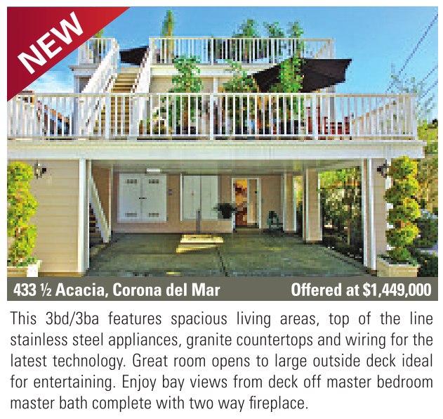 433 ½Acacia, Corona del Mar Offered at $1,449,000 This 3bd/3ba features spacious living areas, top of the line stainless steel appliances, granite countertops and wiring for the latest technology. Great room opens to large outside deck ideal for entertaining. Enjoy bay views from deck off master bedroom master bath complete with two way fireplace.