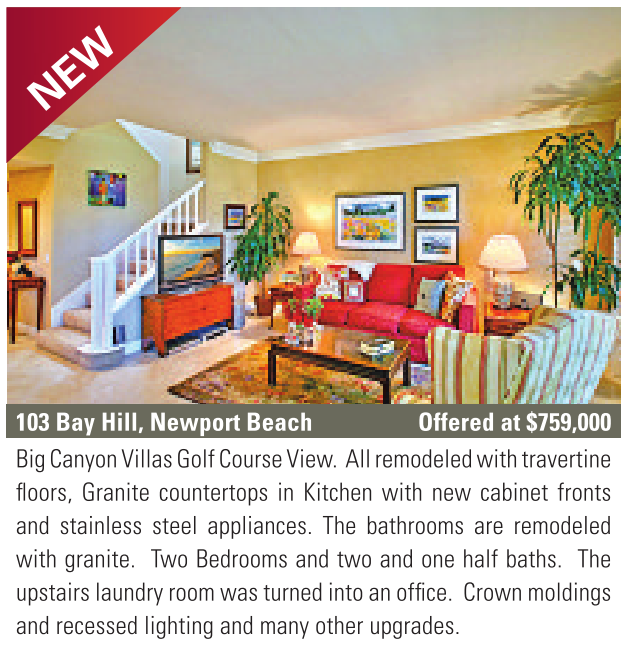 103 Bay Hill, Newport Beach Offered at $759,000 Big Canyon Villas Golf Course View. All remodeled with travertine floors, Granite countertops in Kitchen with new cabinet fronts and stainless steel appliances. The bathrooms are remodeled with granite. Two Bedrooms and two and one half baths. The upstairs laundry room was turned into an office. Crown moldings and recessed lighting and many other upgrades.