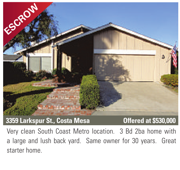 3359 Larkspur St., Costa Mesa Offered at $530,000 Very clean South Coast Metro location. 3 Bd 2ba home with a large and lush back yard. Same owner for 30 years. Great starter home.