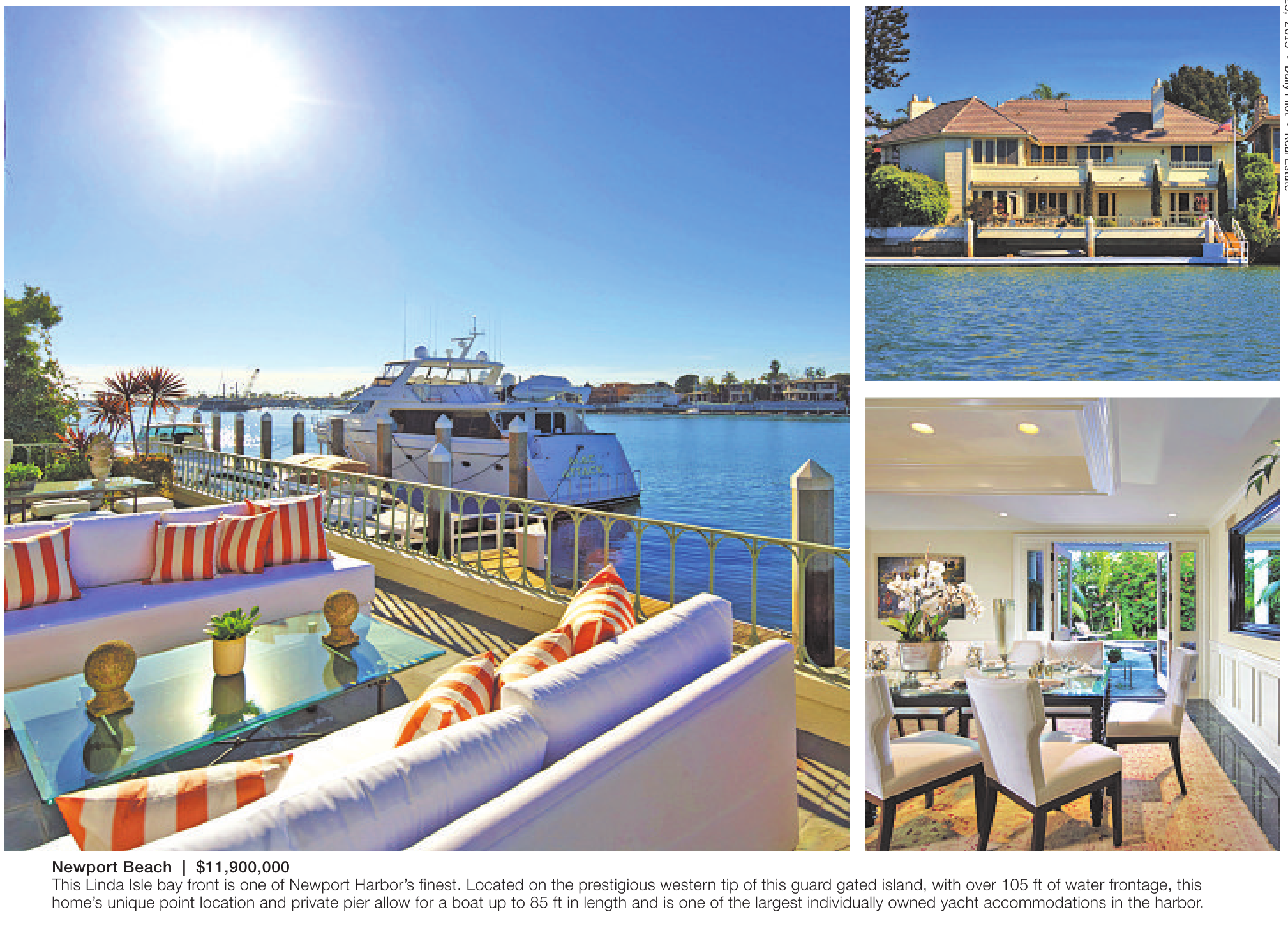 Newport Beach | $11,900,000 This Linda Isle bay front is one of Newport Harbor’s finest. Located on the prestigious western tip of this guard gated island, with over 105 ft of water frontage, this home’s unique point location and private pier allow for a boat up to 85 ft in length and is one of the largest individually owned yacht accommodations in the harbor.