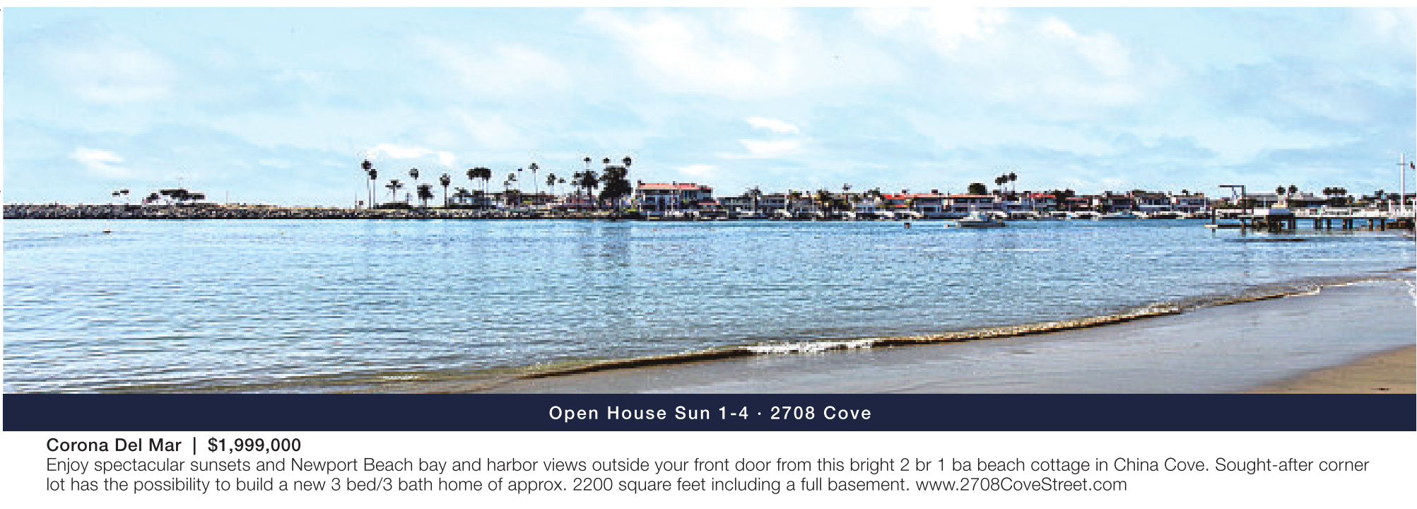 Corona Del Mar | $1,999,000 Enjoy spectacular sunsets and Newport Beach bay and harbor views outside your front door from this bright 2 br 1 ba beach cottage in China Cove. Sought-after corner lot has the possibility to build a new 3 bed/3 bath home of approx. 2200 square feet including a full basement. www.2708CoveStreet.com