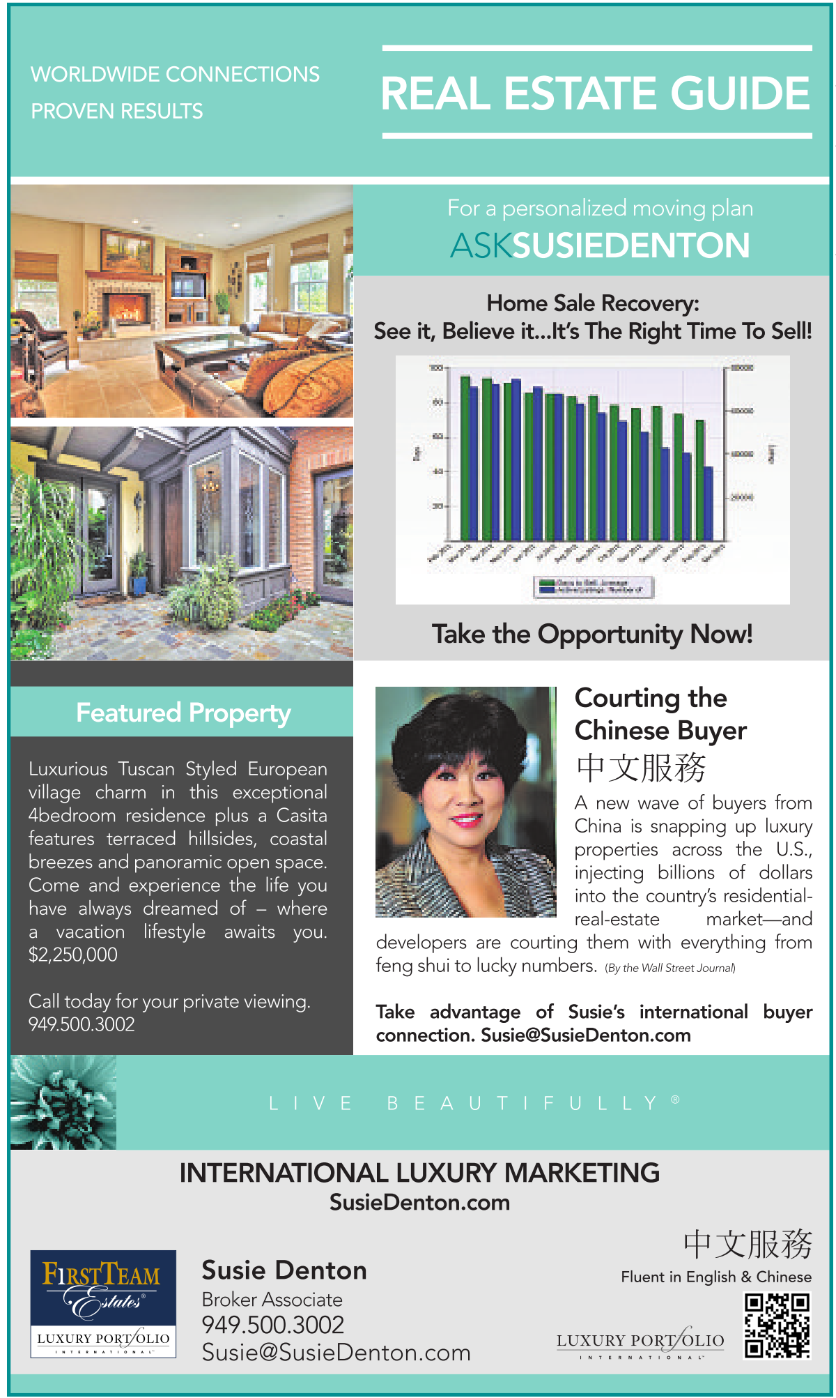 WORLDWIDE CONNECTIONS PROVEN RESULTS REAL ESTATE GUIDE For a personalized moving plan ASKSUSIEDENTON Home Sale Recovery: See it, Believe it...It’s The Right Time To Sell! Featured Property Luxurious Tuscan Styled European village charm in this exceptional 4bedroom residence plus a Casita features terraced hillsides, coastal breezes and panoramic open space. Come and experience the life you have always dreamed of – where a vacation lifestyle awaits you. $2,250,000 Call today for your private viewing. 949.500.3002 Take the Opportunity Now! Courting the Chinese Buyer A new wave of buyers from China is snapping up luxury properties across the U.S., injecting billions of dollars into the country’s residentialreal-estate market—and developers are courting them with everything from feng shui to lucky numbers. (By the Wall Street Journal) Take advantage of Susie’s international buyer connection. Susie@SusieDenton.com L I V E B E A U T I F U L L Y ® INTERNATIONAL LUXURY MARKETING SusieDenton.com Susie Denton Broker Associate 949.500.3002 Susie@SusieDenton.com Fluent in English & Chinese