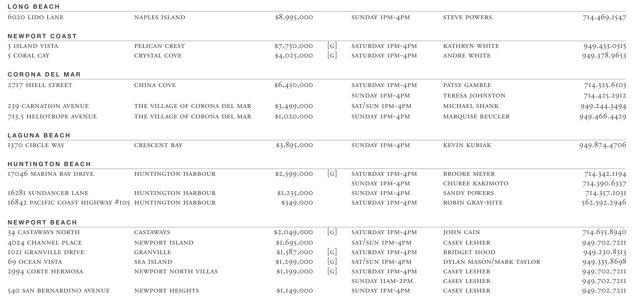 NEWPORT COAST 3 island vista pelican crest $7,750,000 [g] saturday 1pm-4pm kathryn white 949.433.0315 5 coral cay crystal cove $4,025,000 [g] saturday 1pm-4pm andre white 949.378.9653
