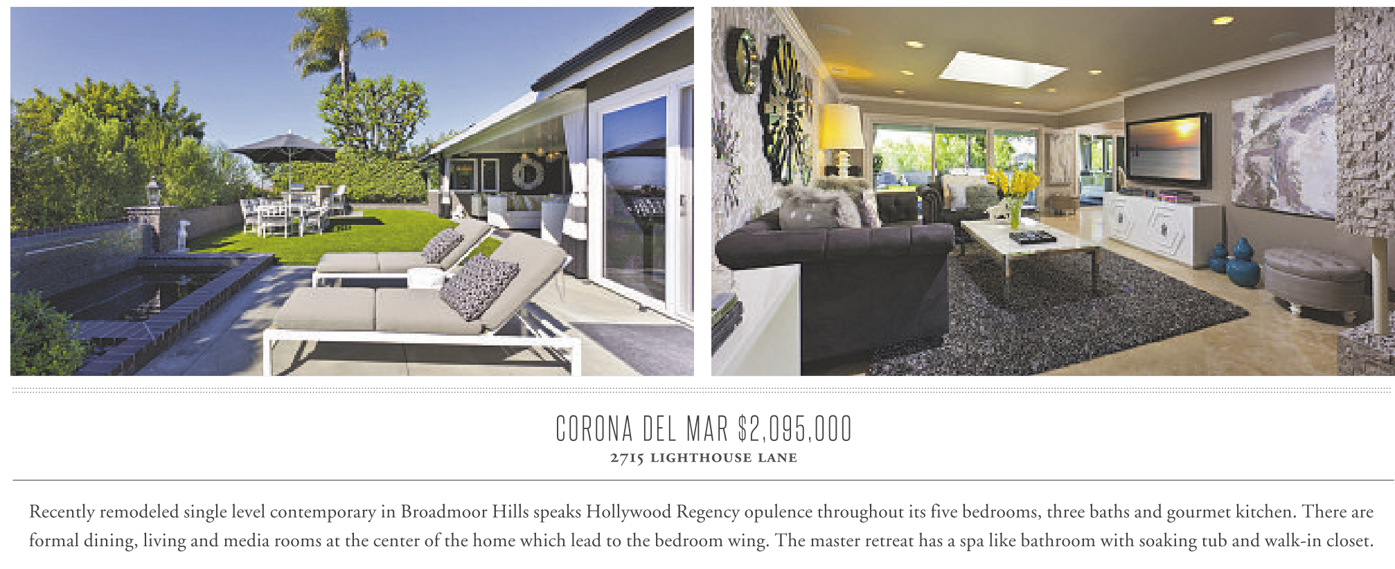 CORONA DEL MAR $2,095,000 2715 lighthouse lane Recently remodeled single level contemporary in Broadmoor Hills speaks Hollywood Regency opulence throughout its five bedrooms, three baths and gourmet kitchen. There are formal dining, living and media rooms at the center of the home which lead to the bedroom wing. The master retreat has a spa like bathroom with soaking tub and walk-in closet.