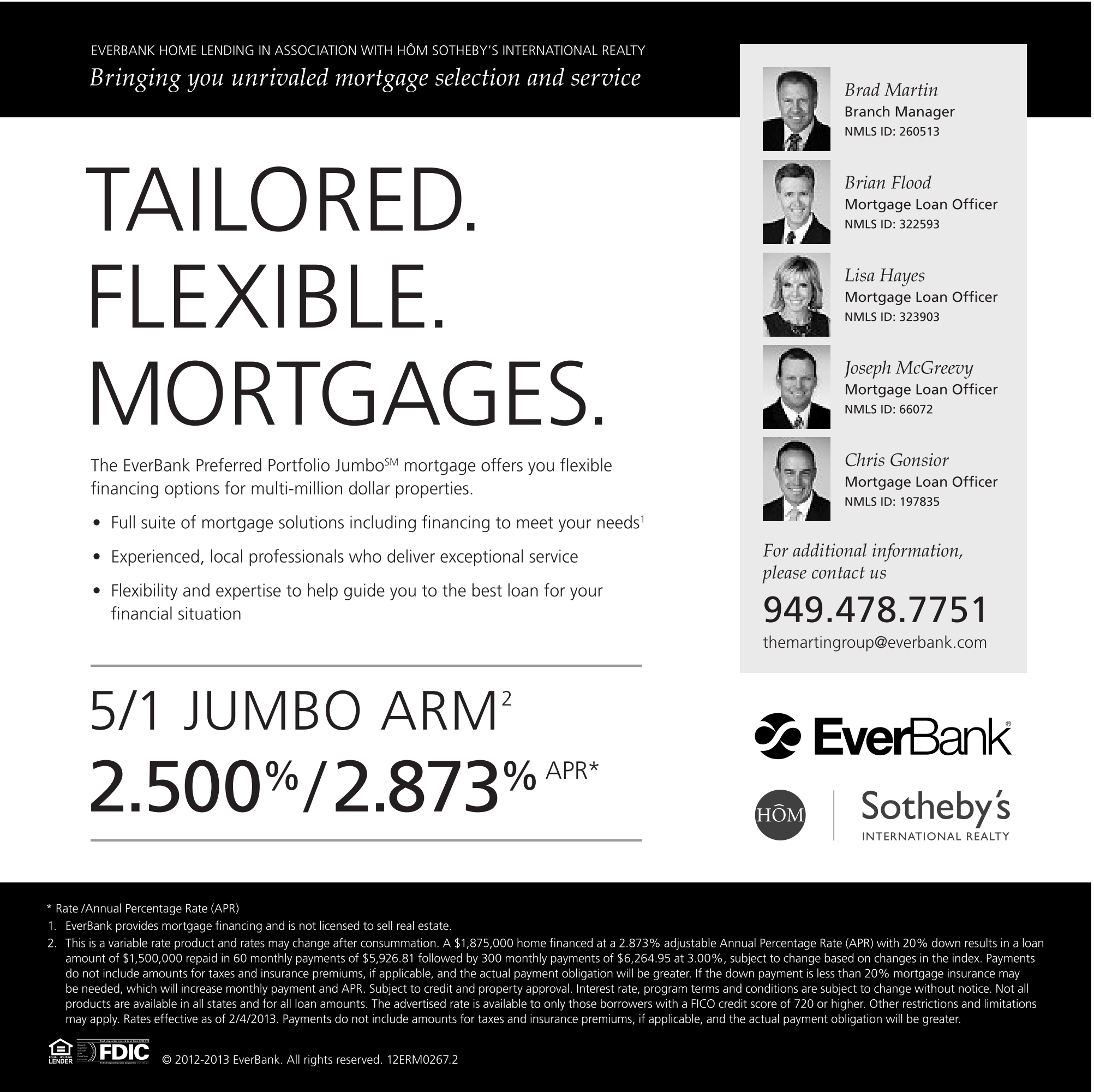 * Rate /Annual Percentage Rate (APR) 1. EverBank provides mortgage financing and is not licensed to sell real estate. 2. this is a variable rate product and rates may change after consummation. A $1,875,000 home financed at a 2.873% adjustable Annual Percentage Rate (APR) with 20% down results in a loan amount of $1,500,000 repaid in 60 monthly payments of $5,926.81 followed by 300 monthly payments of $6,264.95 at 3.00%, subject to change based on changes in the index. Payments do not include amounts for taxes and insurance premiums, if applicable, and the actual payment obligation will be greater. if the down payment is less than 20% mortgage insurance may be needed, which will increase monthly payment and APR. subject to credit and property approval. interest rate, program terms and conditions are subject to change without notice. not all products are available in all states and for all loan amounts. the advertised rate is available to only those borrowers with a Fico credit score of 720 or higher. other restrictions and limitations may apply. Rates effective as of 2/4/2013. Payments do not include amounts for taxes and insurance premiums, if applicable, and the actual payment obligation will be greater.