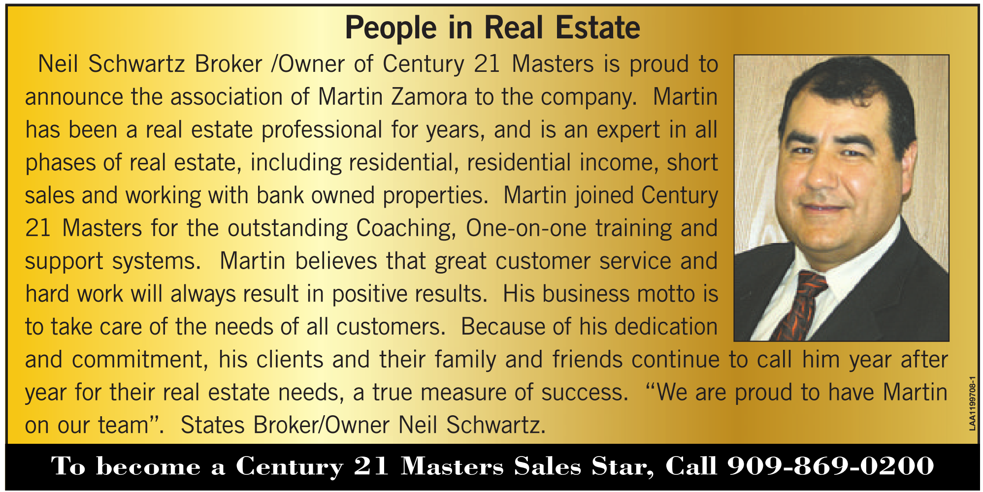 Neil Schwartz Broker /Owner of Century 21 Masters is proud to announce the association of Martin Zamora to the company. Martin has been a real estate professional for years, and is an expert in all phases of real estate, including residential, residential income, short sales and working with bank owned properties. Martin joined Century 21 Masters for the outstanding Coaching, One-on-one training and support systems. Martin believes that great customer service and hard work will always result in positive results. His business motto is to take care of the needs of all customers. Because of his dedication and commitment, his clients and their family and friends continue to call him year after year for their real estate needs, a true measure of success. “We are proud to have Martin on our team”. States Broker/Owner Neil Schwartz.