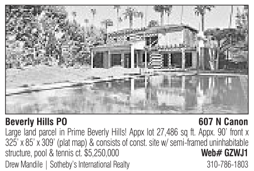 Beverly Hills PO 607 NCanon Large land parcel in Prime Beverly Hills! Appx lot 27,486 sq ft. Appx. 90’ front x325’ x85’ x309’ (plat map) &consists of const. site w/ semi-framed uninhabitable structure, pool &tennis ct. $5,250,000 Web# GZWJ1 Drew Mandile |Sotheby’s International Realty 310-786-1803 See also