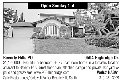 Open Sunday 1-4 Beverly Hills PO 9504 Highridge Dr. $1,199,000. Beautiful 5bedroom +3.5 bathroom home in afantastic location adjacent to Beverly Park. Great floor plan, attached garage and private rear yardw/ patio and grassy area! www.9504highridge.com Web# HABA1 Sally Forster Jones /Coldwell Banker Beverly Hills South 310-281-3999