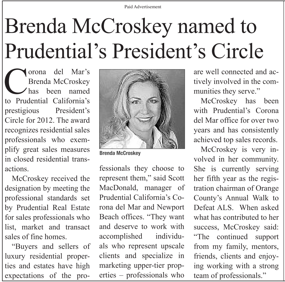 del Mar’s Brenda McCroskey has been named to Prudential California’s prestigious President’s Circle for 2012. The award recognizes residential sales professionals who exemplify great sales measures in closed residential transactions.