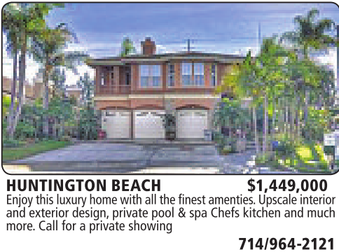 HUNTINGTON BEACH $1,449,000 Enjoy this luxury home with all the finest amenties.Upscale interior and exterior design, private pool &spa Chefs kitchen and much more.Call for aprivate showing 714/964-2121
