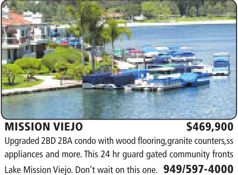 MISSION VIEJO $469,900 Upgraded 2BD 2BAcondo with wood flooring,granite counters,ss appliances and more.This 24 hr guard gated community fronts LakeMission Viejo.Don’t wait on this one. 949/597-4000