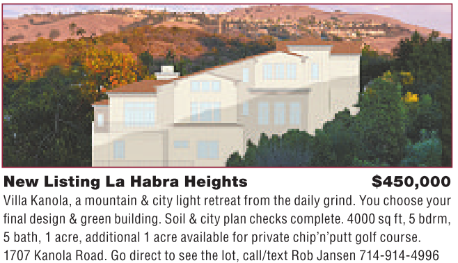 New Listing La Habra Heights $450,000 VillaKanola, amountain&citylight retreatfromthe daily grind. Youchooseyour final design&green building. Soil &cityplancheckscomplete. 4000 sq ft,5bdrm, 5bath, 1acre, additional 1acreavailablefor privatechip’n’puttgolf course. 1707 KanolaRoad. Go direct to see thelot, call/text Rob Jansen 714-914-4996
