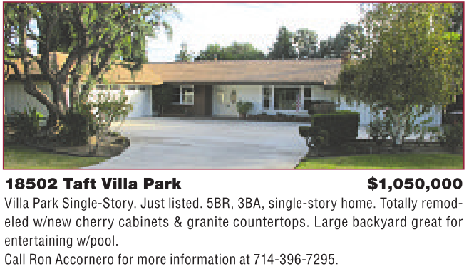 18502 Taft Villa Park $1,050,000 Villa Park Single-Story. Just listed. 5BR, 3BA, single-story home. Totally remodeled w/new cherry cabinets & granite countertops. Large backyard great for entertaining w/pool. Call Ron Accornero formoreinformation at 714-396-7295.