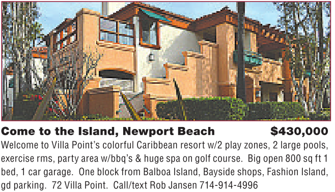 Come to the Island, Newport Beach $430,000 Welcome to Villa Point’s colorful Caribbean resort w/2 play zones, 2large pools, exerciserms, partyareaw/bbq’s &hugespa on golfcourse. Bigopen800 sq ft 1 bed, 1car garage. One block from Balboa Island, Bayside shops, Fashion Island, gd parking. 72 VillaPoint. Call/text Rob Jansen 714-914-4996