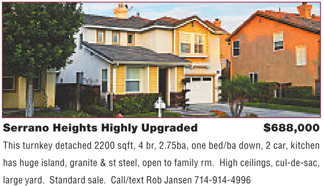 Serrano Heights Highly Upgraded $688,000 This turnkey detached 2200 sqft, 4br, 2.75ba, one bed/ba down, 2car, kitchen has huge island, granite &ststeel, open tofamily rm. High ceilings, cul-de-sac, largeyard. Standard sale. Call/text Rob Jansen 714-914-4996