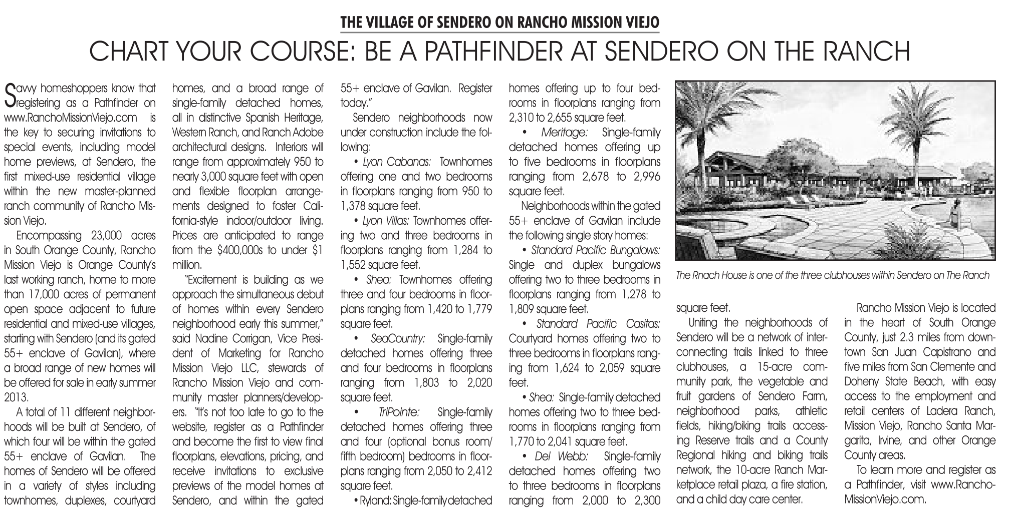 homeshoppers know that registering as a Pathfinder on www.RanchoMissionViejo.com is the key to securing invitations to special events, including model home previews, at Sendero, the first mixed-use residential village within the new master-planned ranch community of Rancho Mission Viejo.